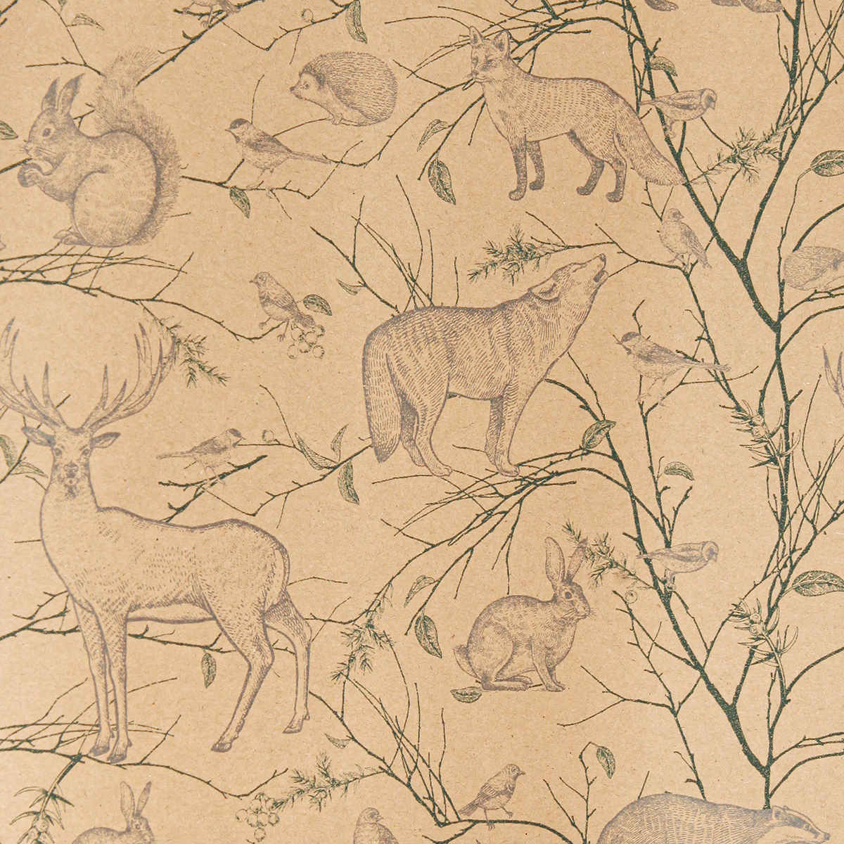 Papel de regalo animales bosque en marrón azul 70cm x 200cm