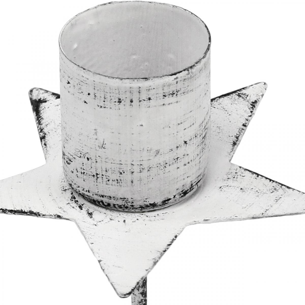 El portavelas de metal blanco presenta un moderno diseño shabby chic, ideal para decoraciones navideñas de estilo rústico y natural. Su larga punta permite insertarlo fácilmente en coronas de espuma floral o paja. También se puede insertar en recipientes con tierra o arena decorativa, formando una estrella.