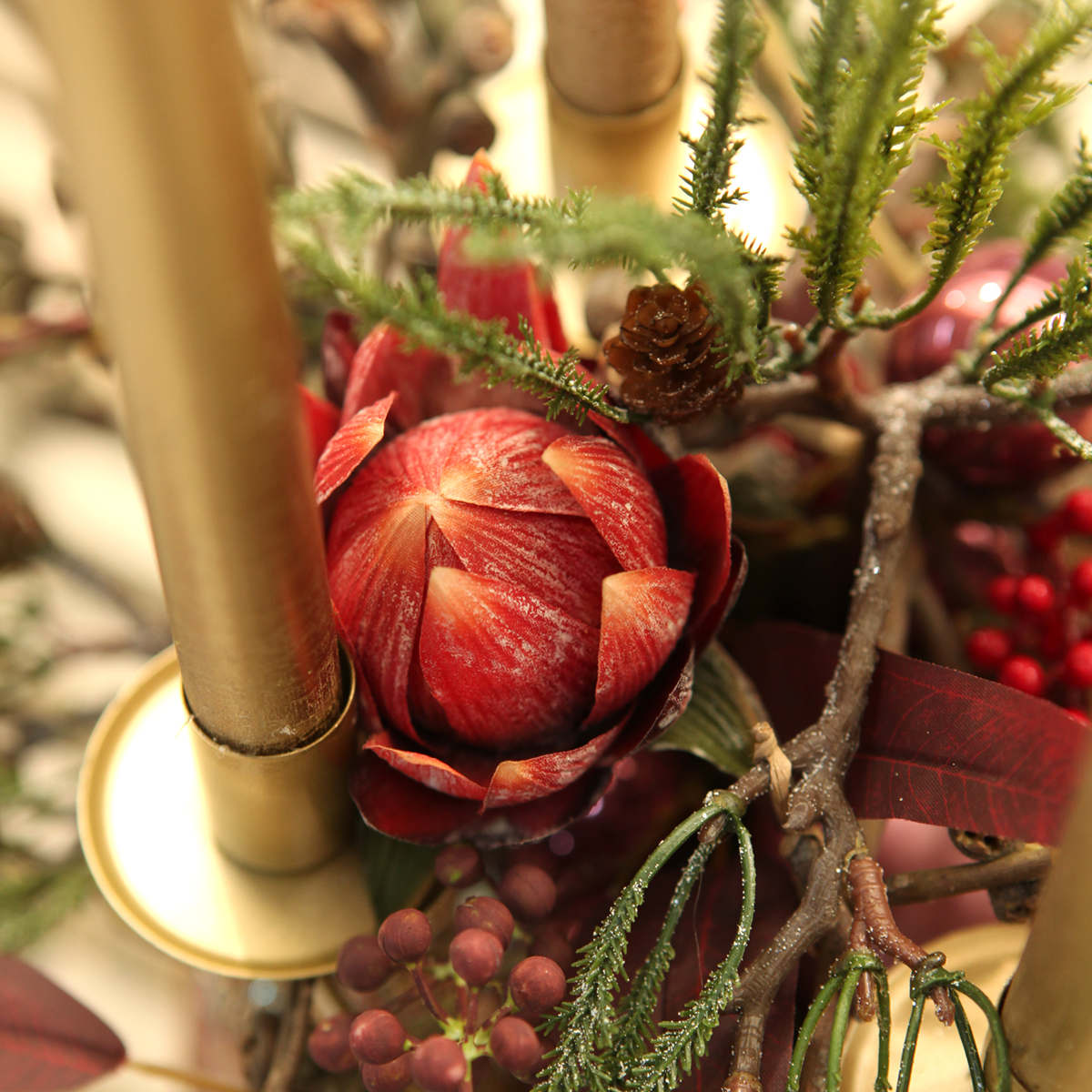 Nuestras proteas artificiales en rojo anaranjado ofrecen una exquisita decoración para quienes buscan añadir un toque exótico a su hogar o evento. Con aproximadamente 34 cm de largo, las tres grandes flores rojo anaranjado se reproducen fielmente y se complementan con hojas verdes y sutiles toques blancos. Gracias a sus tallos flexibles con núcleo de alambre, estas Protea cynaroides (Proteas reales) pueden colocarse de forma estable en jarrones o incorporarse en sofisticadas coronas o arreglos florales. El color rojo de estas flores artificiales irradia vitalidad y el equilibrio perfecto entre fuerza y elegancia. Ya sea como una elegante decoración para el salón o para una suntuosa decoración de mesa para ocasiones festivas, estas flores artificiales rojas son un verdadero punto de atracción.