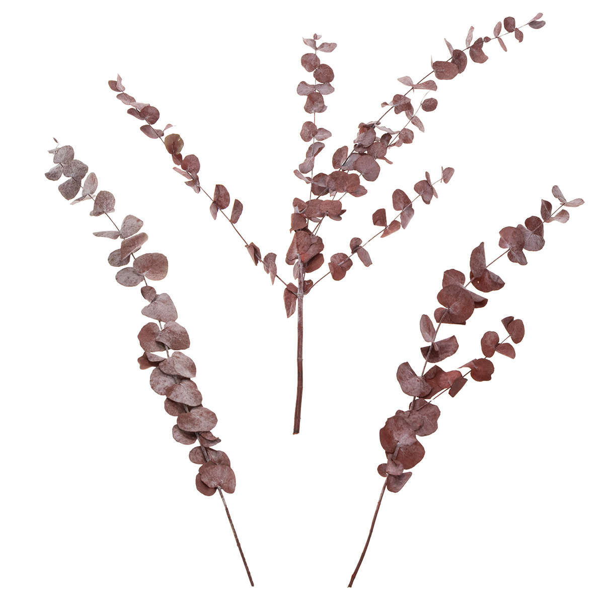 Las hojas de la especie Eucalyptus cynerea presentan un sutil tono rojo burdeos que hace que esta decoración natural sea especialmente atractiva. Las hojas suelen ser anchas y ovaladas, y crecen en pares.