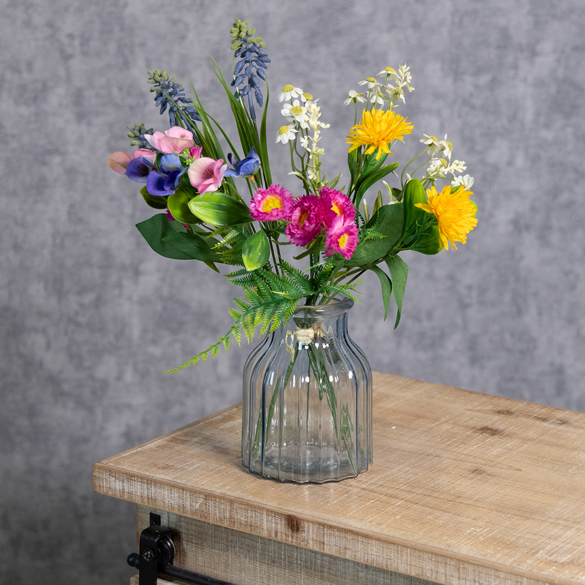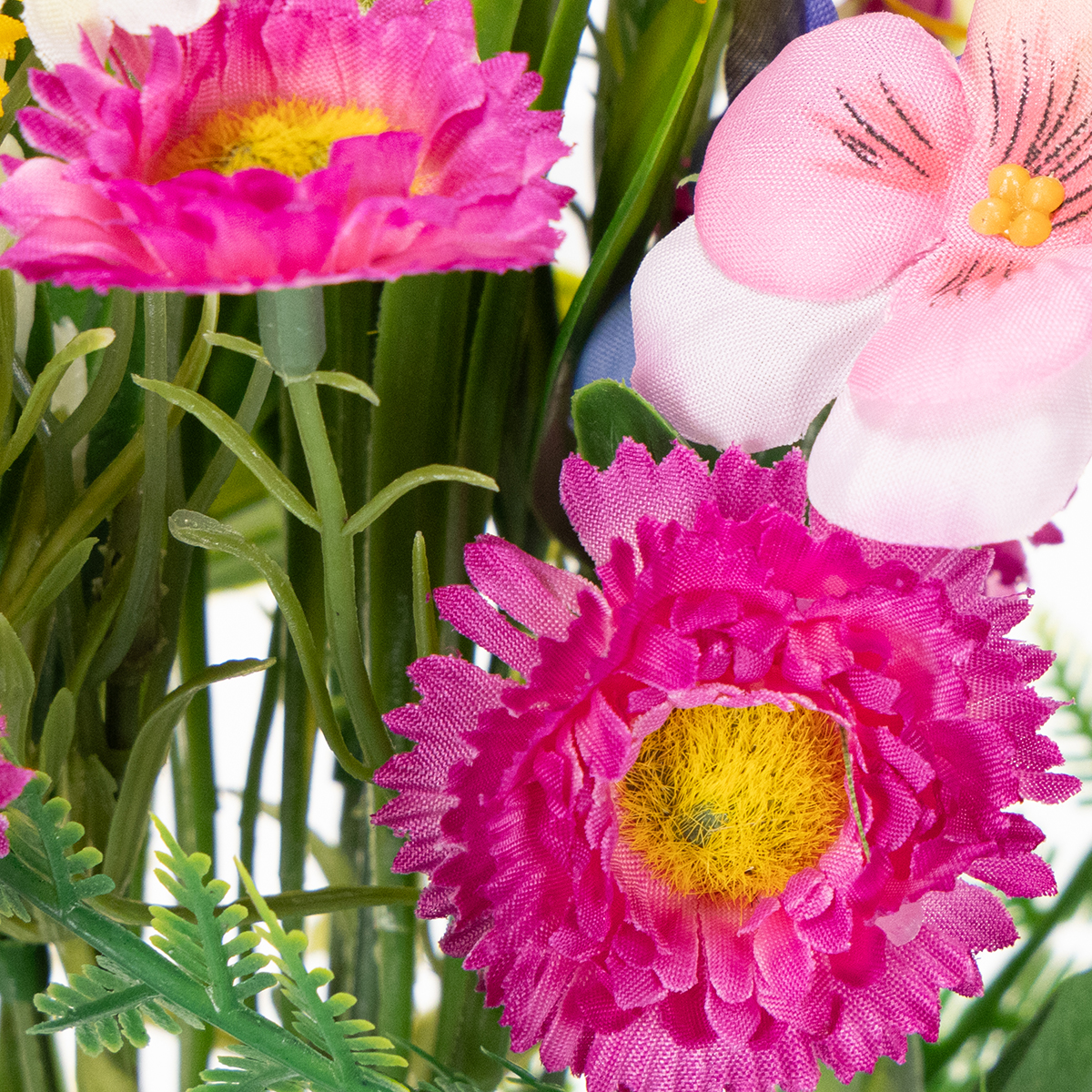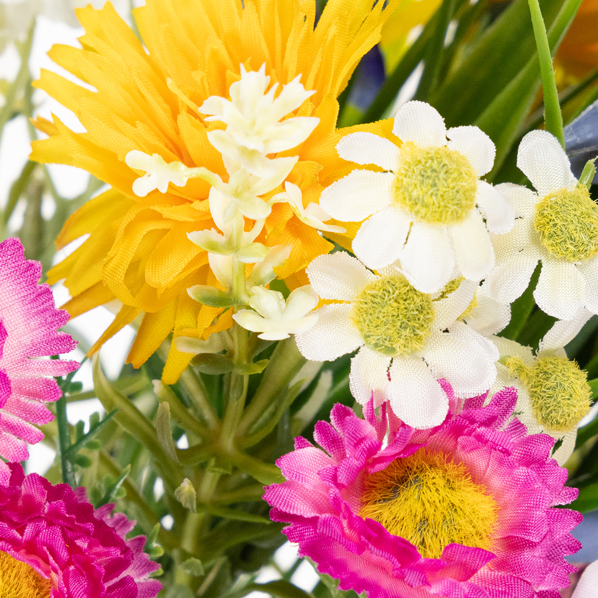 Este ramo de flores artificiales de colores brillantes, con sus detalladas flores en vibrantes tonos amarillo, rosa y azul, trae la primavera a tu hogar. Hecho de poliéster y plástico de alta calidad, luce increíblemente realista e impresiona por su excepcional solidez del color y retención de forma. La combinación de coloridas flores primaverales y tonos verdes naturales lo hace particularmente versátil: complementa un interior de estilo rústico, realza la decoración escandinava y armoniza a la perfección con diseños modernos.