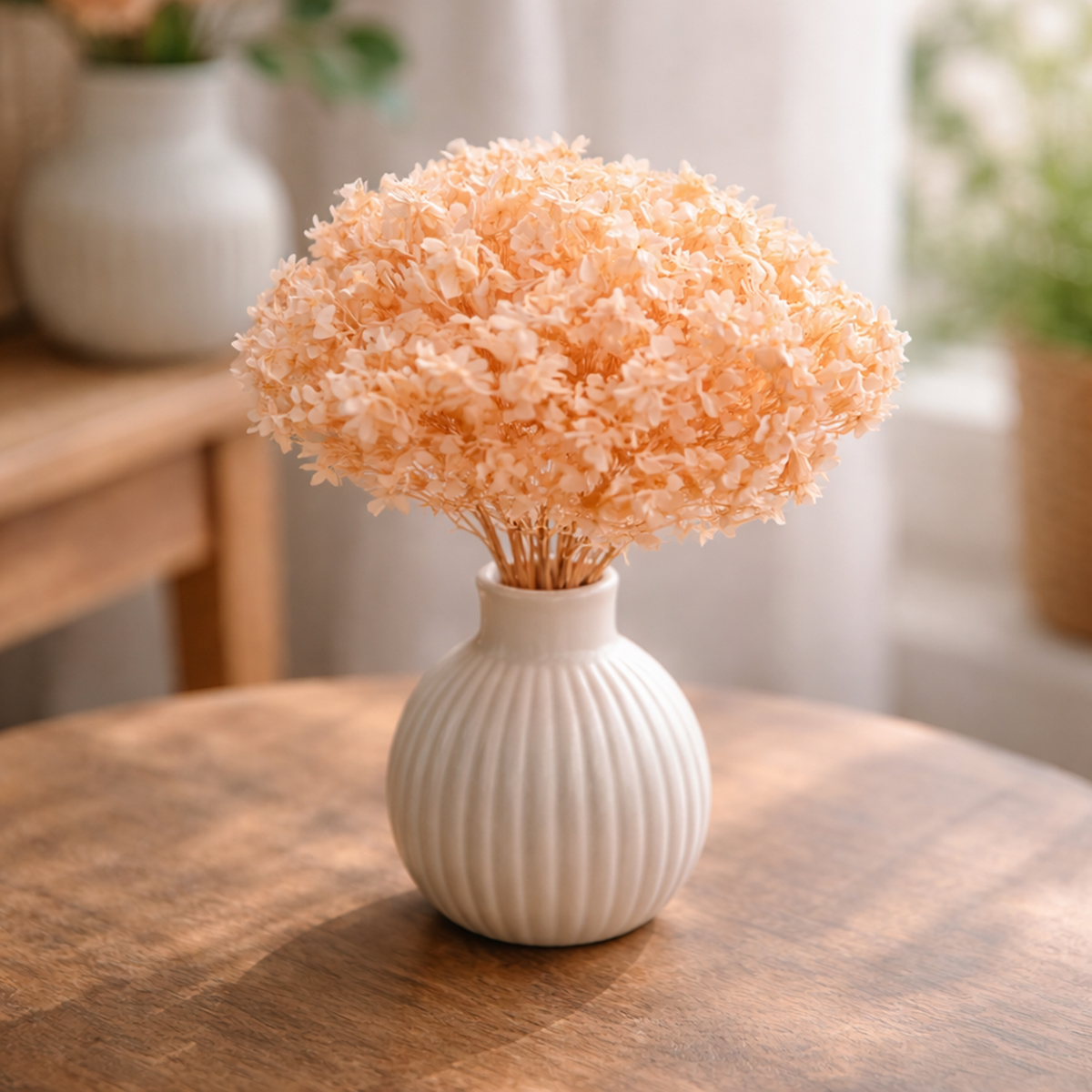 Nuestras hortensias secas se integran a la perfección en cualquier ambiente, ya sea moderno, escandinavo o romántico. Sus grandes flores de color naranja claro aportan a tu decoración un toque suave y cálido, y sin duda llamarán la atención. Coloca el ramo en un jarrón sencillo para realzar su belleza natural o combínalo con otras flores secas para un arreglo más opulento. Es ideal para la decoración de salones y comedores, pero también para bodas y eventos. Una sola basta para llenar una habitación de elegancia floral.