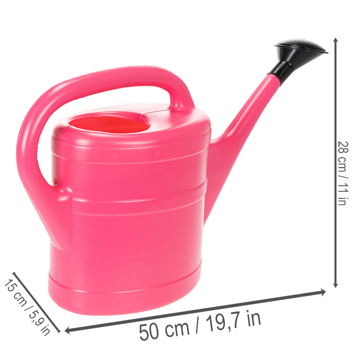 La regadera rosa tiene una capacidad de hasta 5 litros y, además de su asa y cuello, incluye un adorno de rosa negra. Esta regadera ligera se puede guardar al aire libre sin problemas, ya que el plástico es resistente a la intemperie.