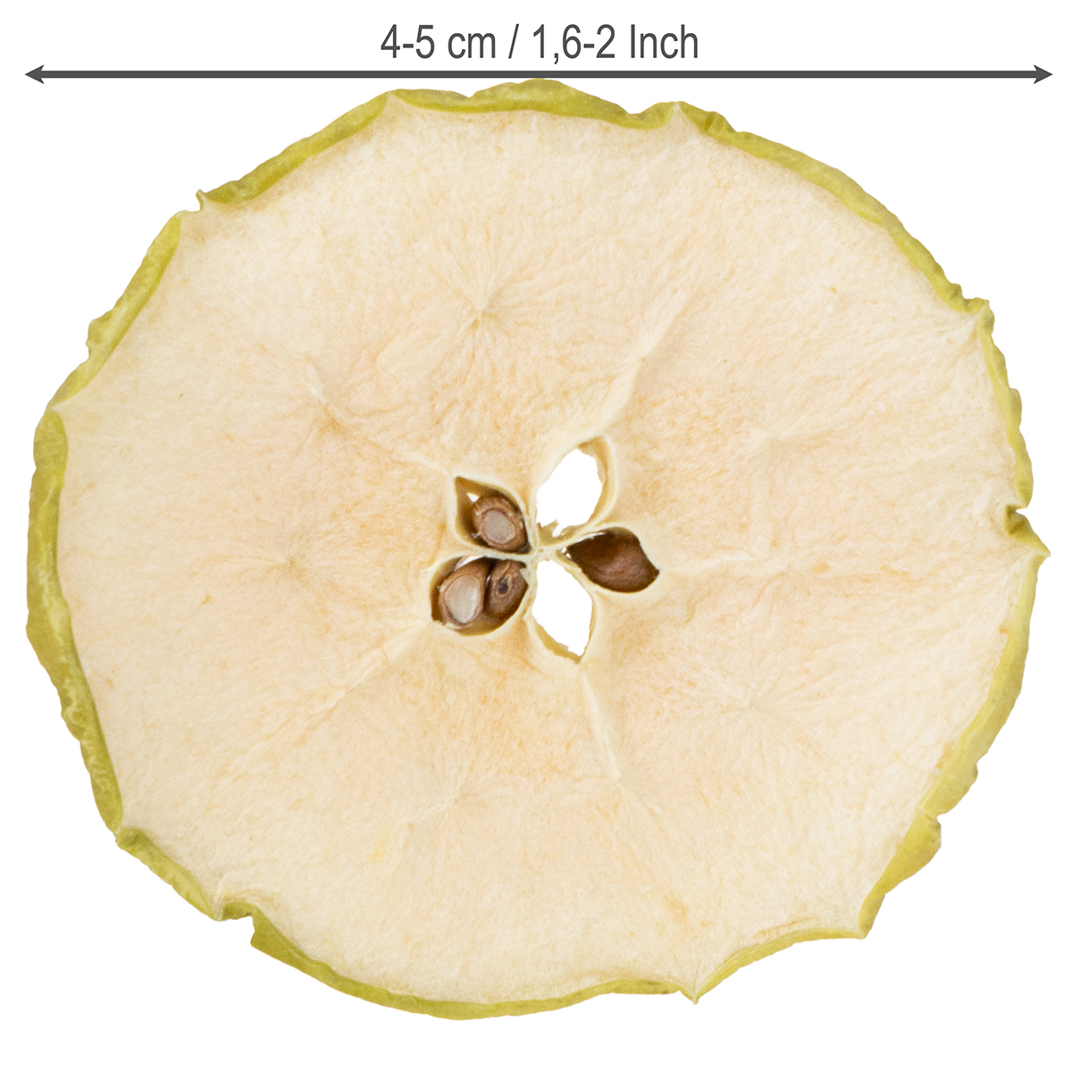 En cada paquete de 500 gramas hay varias rodajas de manzana roja para decorar, todas las cuales son naturalmente de tamaños ligeramente diferentes. Por lo tanto, los discos tienen un diámetro de aproximadamente 4 a 5 centímetros y son una decoración en el camino de la mesa en la mesa del comedor, un efecto extraordinario que es insuperable.