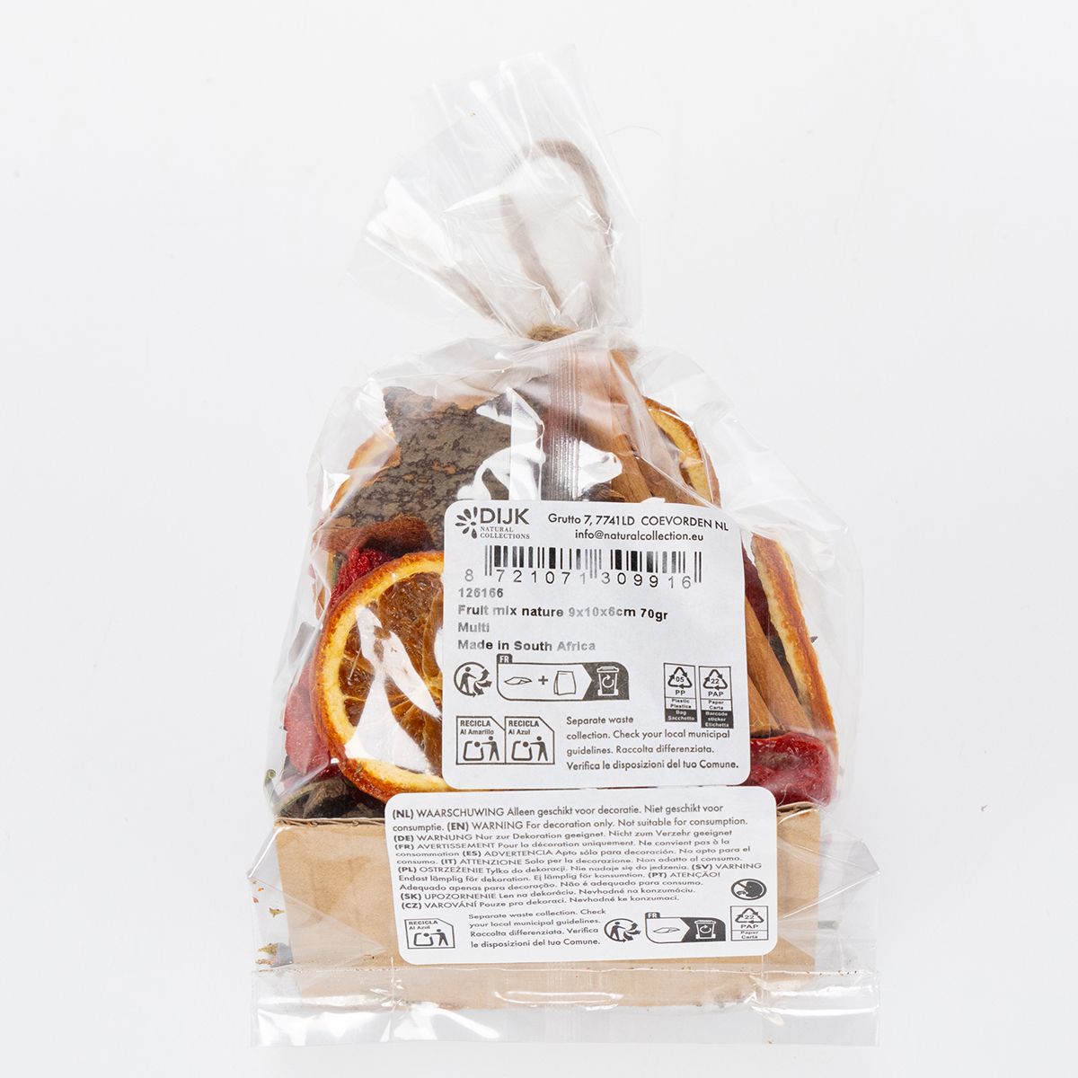 - Contenido: Rodajas de naranja secas, ramas de canela, anís estrellado, estrellas de madera, pimientos rojos ornamentales.