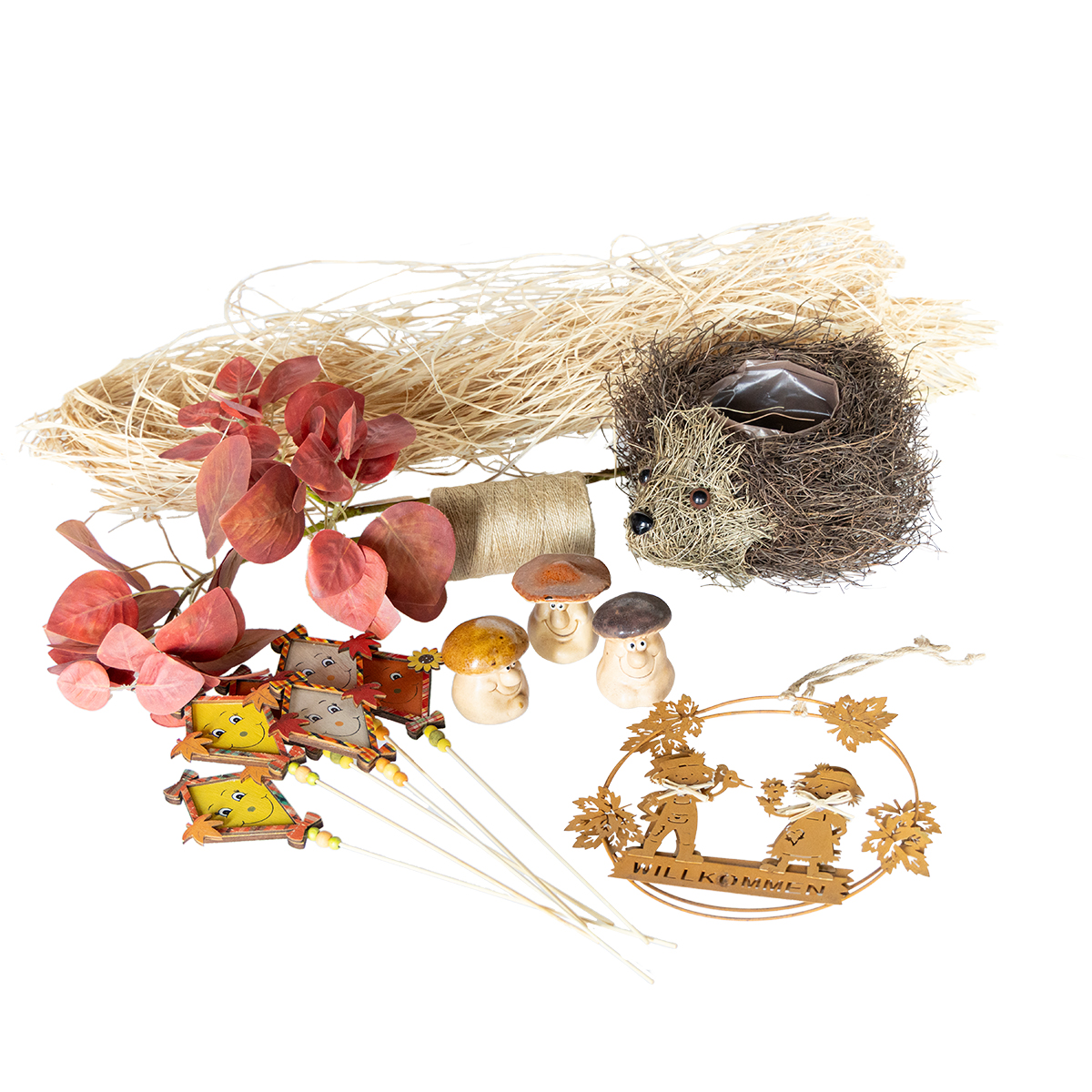 Nuestro set de decoración otoñal combina todo lo necesario para una decoración otoñal evocadora. Este adorable erizo hecho de enredaderas llamará la atención en habitaciones rústicas y acogedoras, perfecto para un estilo campestre. Se complementa con setas en miniatura en cálidos tonos marrón, beige y rojo óxido, además de divertidos palillos de flores, práctico cordel de yute, hojas otoñales rojas realistas como plantas artificiales y un cartel de bienvenida en color óxido.