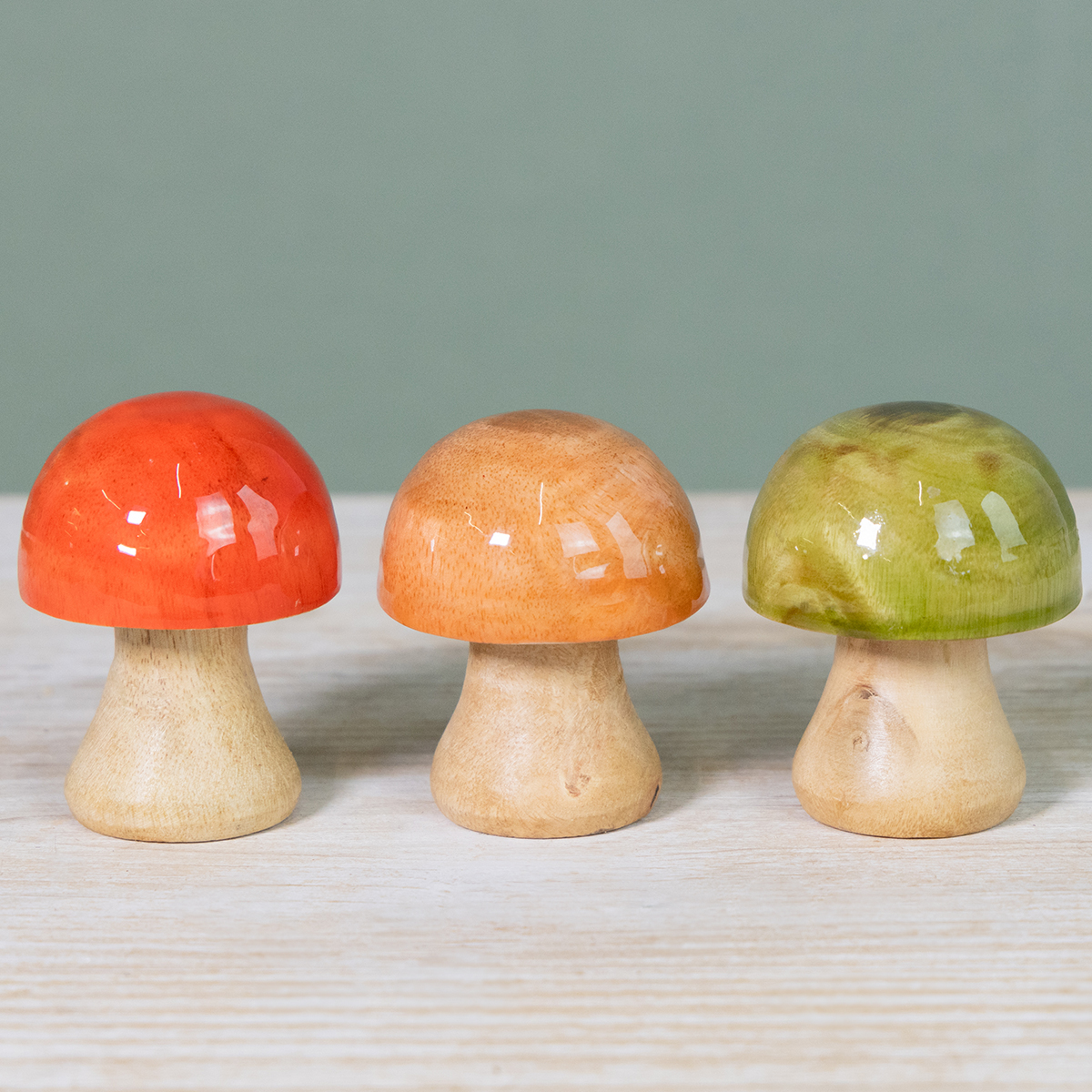 Setas de madera, decoración otoñal, setas verdes, rojas y naranjas, 6,5 cm de alto, 9 unidades