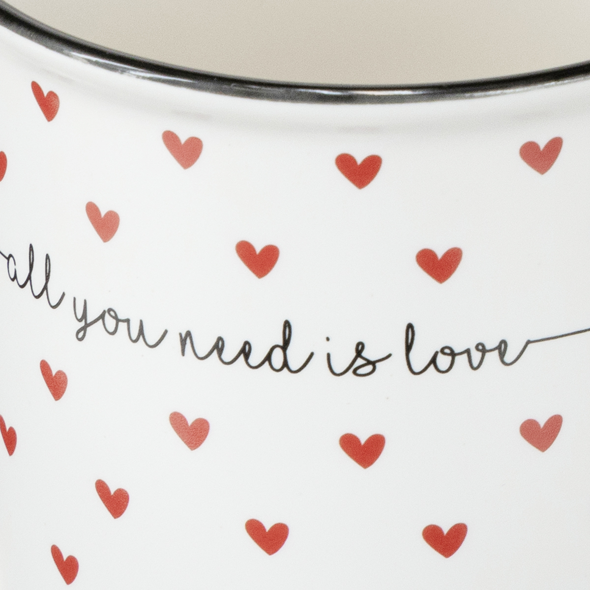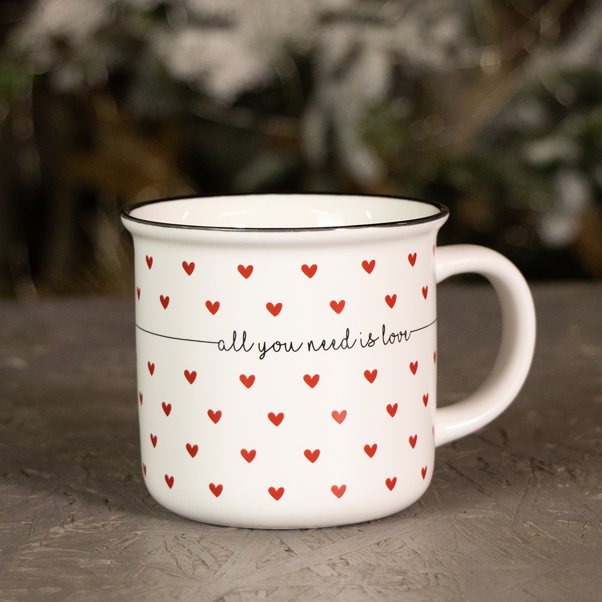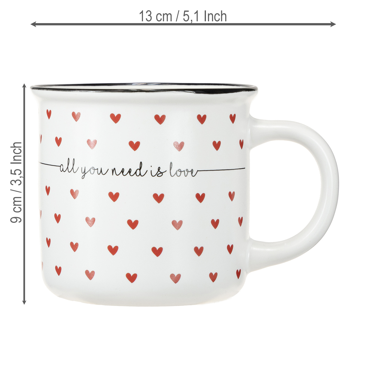 Esta taza con forma de corazón es mucho más que un simple recipiente para tu bebida favorita. Con su encantador diseño —fondo blanco, pequeños corazones rojos y la inscripción "All you need is love"—, te sacará una sonrisa. El fino borde negro añade un toque elegante y complementa a la perfección la paleta de colores rojos. El asa es cómoda de sostener, mientras que la cerámica promete una artesanía robusta y de alta calidad. Ideal para usar en la oficina o como una sorpresa de desayuno para tu pareja. Cualquier amante del estilo escandinavo se enamorará de esta mezcla de sencillez y romanticismo. ¡Combínala con nuestras servilletas blancas y rojas o un ramo decorativo de rosas artificiales de Floristik24! Ya verás: esta taza encaja a la perfección tanto en cocinas minimalistas como en acogedoras cocinas de estilo rústico, aportando un toque romántico a cualquier espacio.
