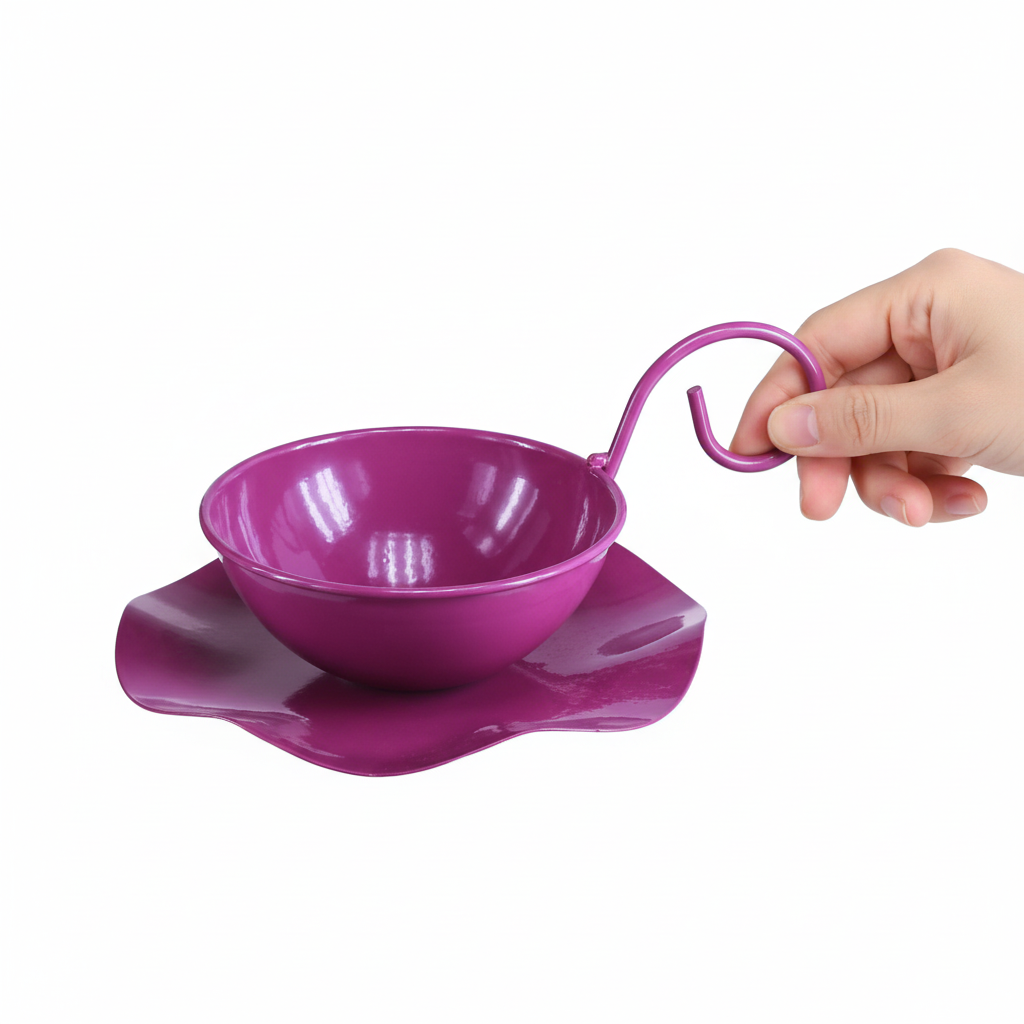 Deleita tus flores con la taza decorativa de metal violeta. ¡Esta taza de té añadirá color a tu decoración como cuenco de flores en primavera y verano! Con un diámetro de apertura de aproximadamente 11,5 cm y una altura de 8 cm, es ideal para diversos fines decorativos, tanto en interiores como en el jardín de verano. El color violeta desprende una elegancia misteriosa y armoniza perfectamente con tonos pastel naturales o colores llamativos, lo que abre numerosas posibilidades de diseño creativo. Destacan especialmente el asa elegantemente curvada y el platillo con forma de flor ondulada fijado a la taza, que no sólo convence visualmente sino también funcionalmente. Esta taza decorativa lacada en violeta se suministra en juegos de dos y es absolutamente imprescindible para cualquiera que quiera enriquecer su entorno con toques de buen gusto.