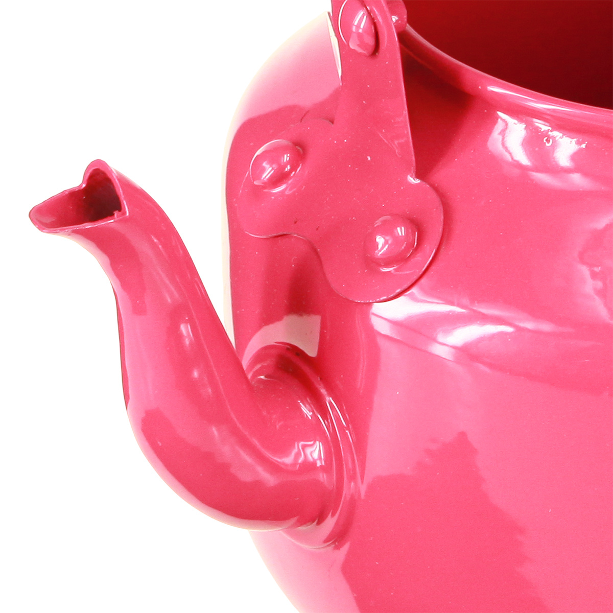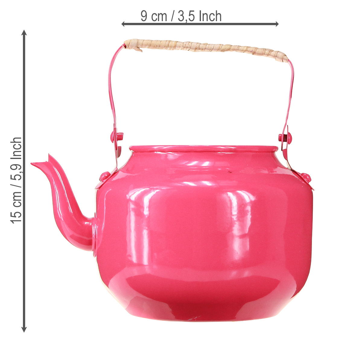 ¿Por qué esta tetera en particular? Su práctico tamaño, de 15 cm de alto y 11 cm de diámetro, la convierte en un objeto versátil que cumple una función tanto decorativa como práctica. Su color rosa es fresco y alegre, pero a la vez clásico, sin resultar recargado. El robusto metal garantiza durabilidad y estabilidad, mientras que el asa rústica con detalles de bambú complementa a la perfección el estilo campestre.