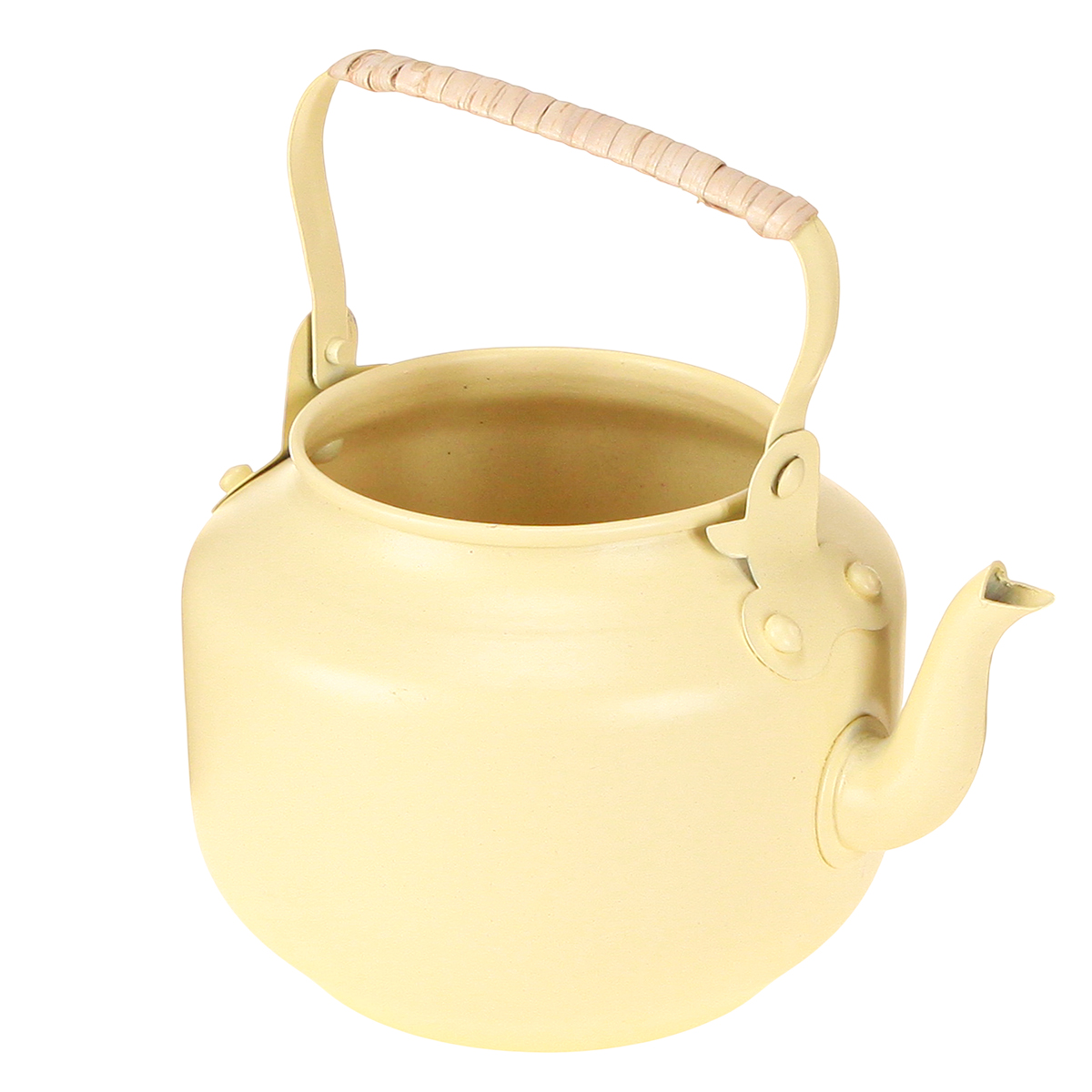 Esta tetera amarilla decorativa es un bello ejemplo de artesanía tradicional y diseño cuidado de estilo rústico. Fabricada en metal resistente, transmite una sensación de durabilidad visible y tangible. Su suave color crema, con sutiles matices amarillos, complementa una variedad de estilos de decoración, desde el encanto rústico retro hasta el moderno shabby chic. Una característica especialmente destacable es el asa de madera revestida de material natural, que no solo es visualmente atractiva, sino también cómoda de sostener.