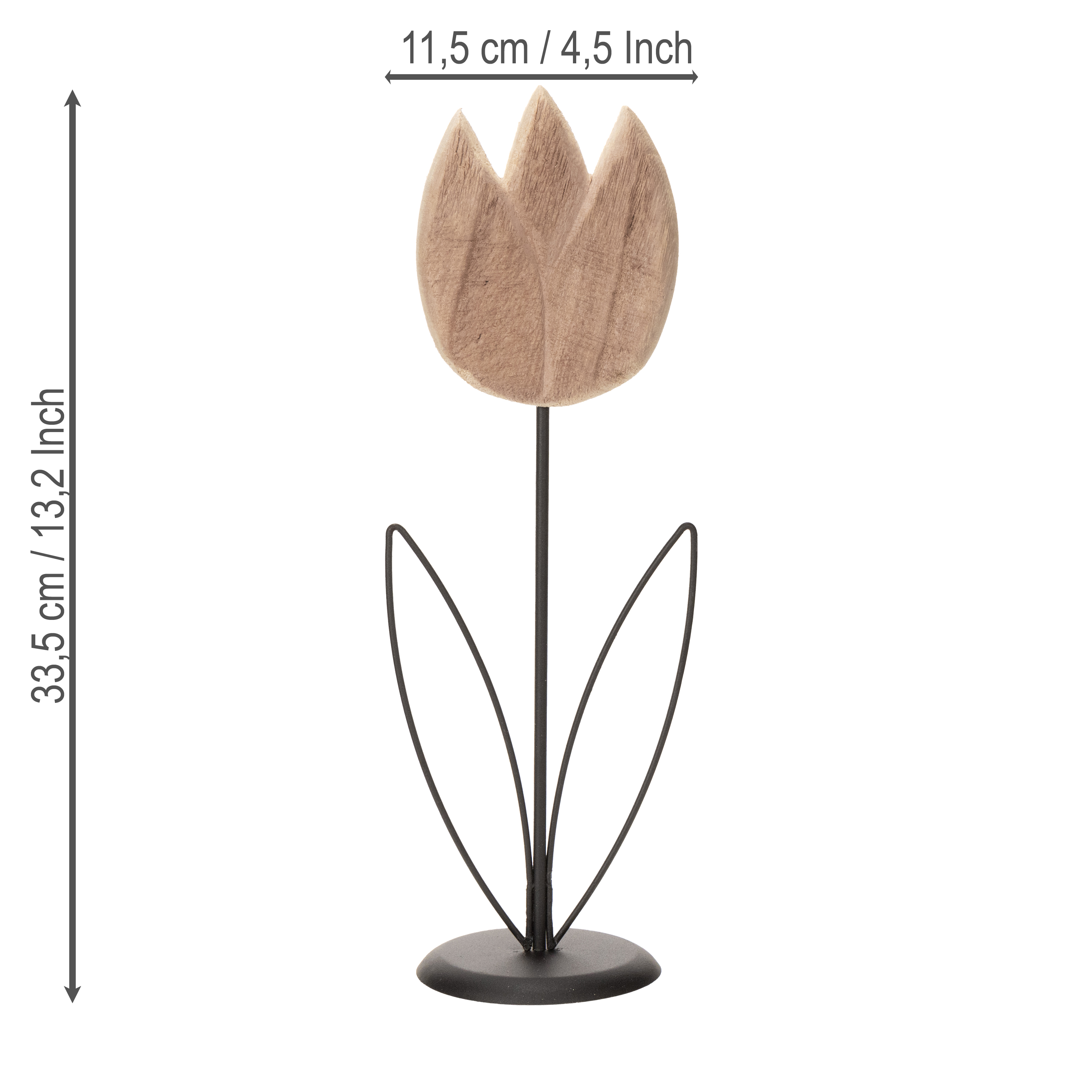 Este tulipán decorativo se distingue por su diseño sencillo pero expresivo. Su cabeza en forma de tulipán está elaborada con madera de alta calidad, cuya veta natural le confiere un aspecto particularmente auténtico. Las hojas, el tallo y la base son de metal resistente, lo que garantiza su estabilidad. Ya sea que prefiera un estilo de interior moderno, escandinavo o atemporal, este tulipán decorativo se integra a la perfección en cualquier ambiente. Queda especialmente bonito combinado con otros elementos decorativos de metal o madera, por ejemplo, en un pequeño arreglo con velas o jarrones.