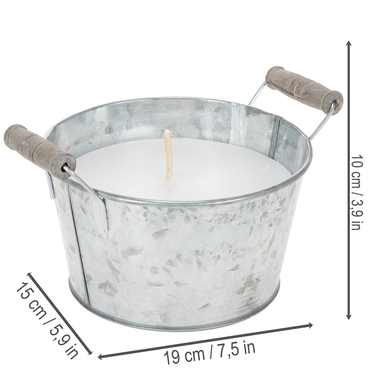Con 10 centímetros de alto y 15 centímetros de diámetro, esta vela en un cubo de zinc no solo es práctica, sino también un elemento decorativo que llama la atención. El robusto cubo de zinc con asas de madera añade un toque rústico a cualquier ambiente, mientras que la cálida luz de la vela crea una atmósfera acogedora en tu balcón. Es ideal para iluminar el patio, como decoración ambiental para fiestas o simplemente para embellecer tu espacio exterior a diario. La combinación de cera blanca y zinc sencillo refleja el encanto natural del estilo campestre y combina a la perfección con plantas verdes, arreglos florales u otros elementos decorativos. Ya sea en la mesa del jardín o junto a una tumbona, el brillo romántico de esta vela embellecerá cualquier espacio.