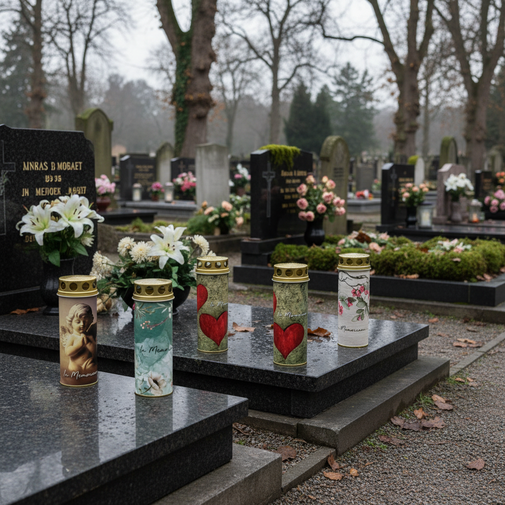 Con motivos primaverales, como flores o ángeles, o estampados con símbolos de amor, como una rosa roja y corazones, las velas especiales para tumbas se pueden utilizar en primavera como decoración para tumbas. Pero las velas impresas no tienen por qué esconderse todo el año en un farol para tumbas. También puedes colocar maravillosamente las velas de luto en conmemoraciones o en memoria del difunto.