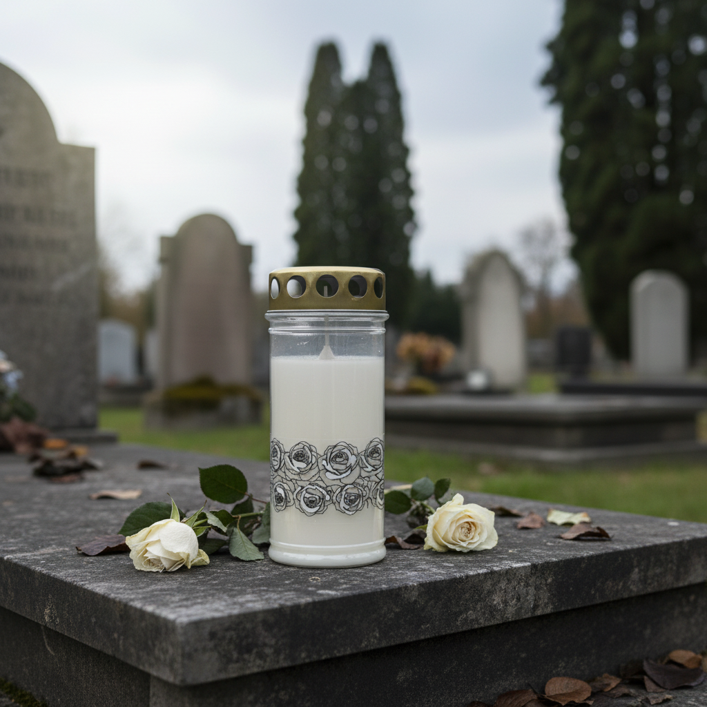 La cera es blanca, la capa transparente. Las rosas en la vela de la tumba parecen como si algunas de ellas también fueran de color blanco. La impresión la dan las finas líneas oscuras que dibujan los pétalos.