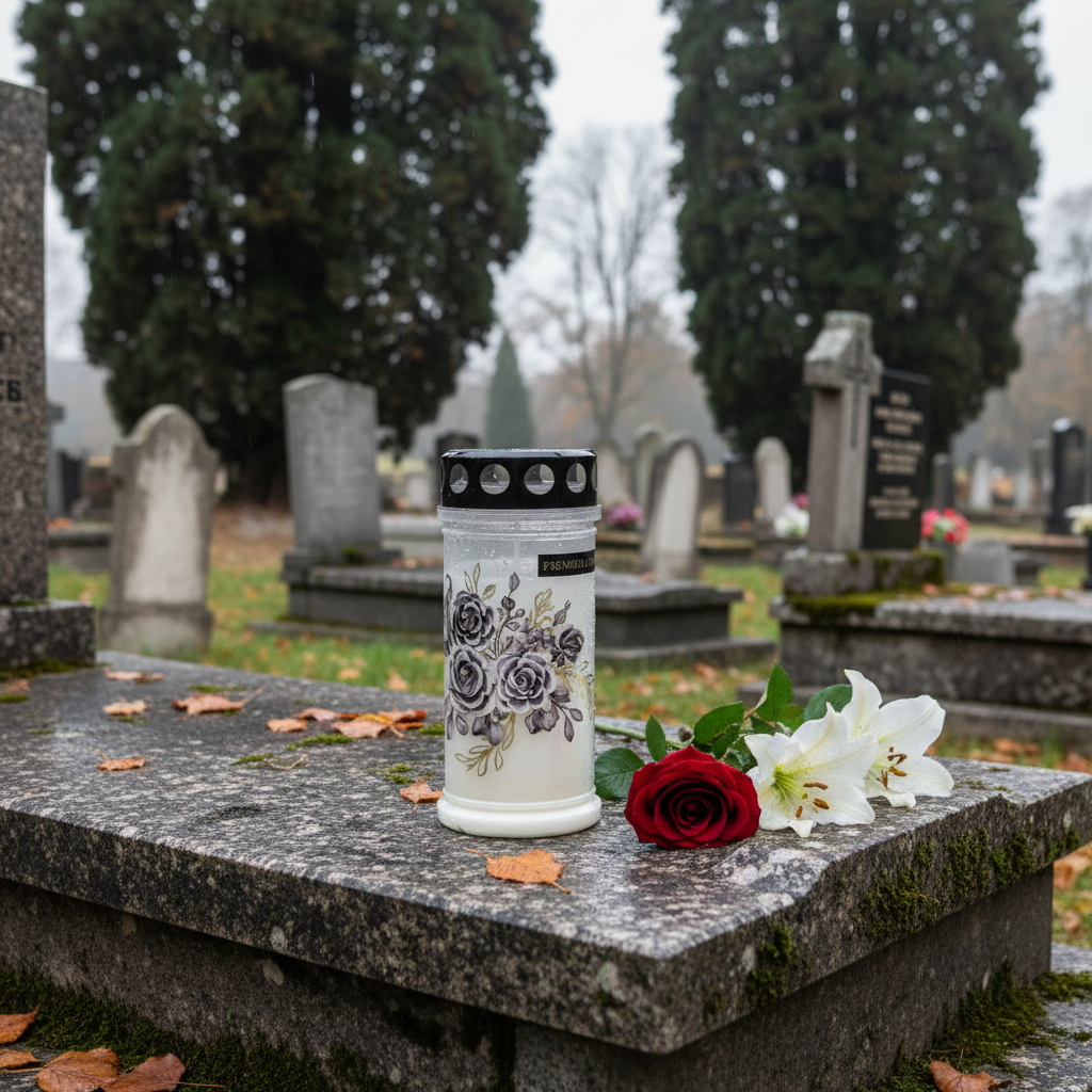 Resistentes al viento y a la intemperie, estas velas con motivos de alta calidad arden de forma uniforme y con mínima emisión de hollín. Gracias a su cera compuesta de alta calidad, garantizan una duración de hasta tres días, lo que las convierte en una opción fiable para cementerios.