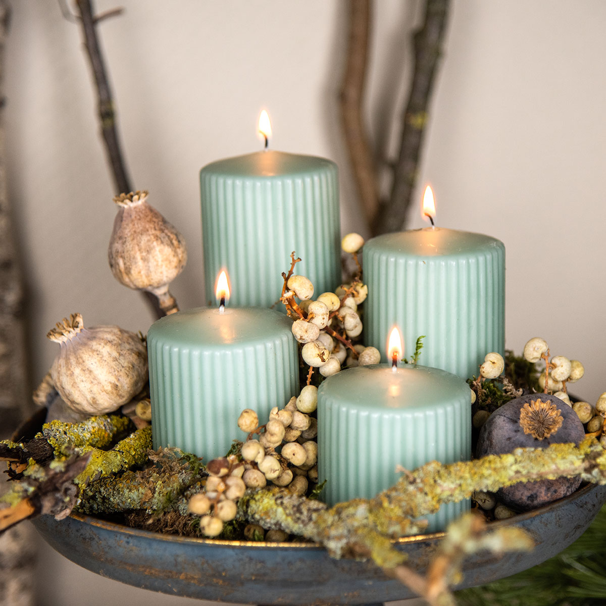 El fresco verde esmeralda armoniza con muchas ideas decorativas originales. Ya sea que combine las velas acanaladas con accesorios blancos, dorados, celestes o negros, estas velas siempre irradian elegancia.