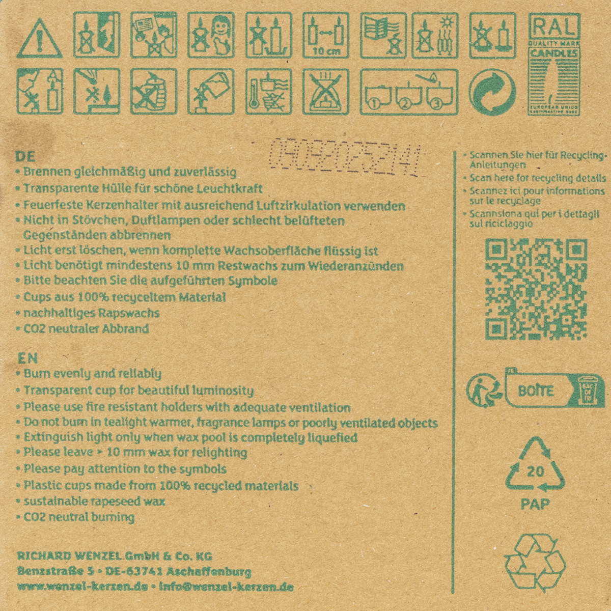 Material: cera de colza, mecha, plástico, metal